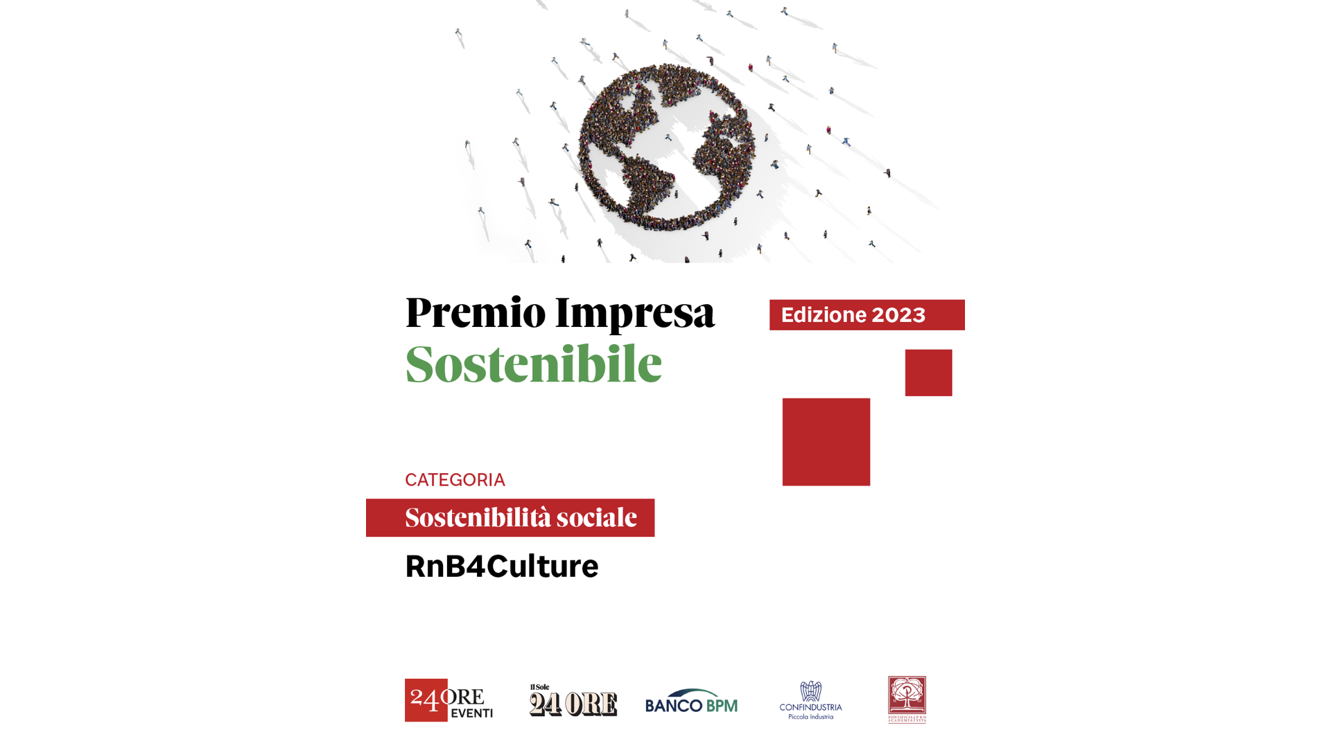 Nella categoria “Sostenibilità Sociale”, che comprende l’insieme di tutte le azioni ed innovazioni poste in essere dall’azienda, a partire dall’anno 2020, finalizzate al raggiungimento dell’equità nella società è stata premiata RnB4Culture di Jesi (AN) per l’applicazione delle più innovative tecnologie di ArtTech e Digital Culture alla promozione e alla valorizzazione del patrimonio storico-culturale permettendo di ottimizzare la propria gestione e l’accesso del pubblico in una logica inclusiva e «user centered». RnB4Culture opera da fine 2019 per l’introduzione di nuovi modelli di valorizzazione dei Luoghi della Cultura in una logica integrata di utilizzo della tecnologia a supporto di una forza lavoro strutturata in modo virtuoso rispetto al settore di riferimento. L’azienda opera in una logica ESG integrando supporto alla persona, efficientamento energetico dei luoghi dove opera e innovazione tecnologica. Per il valore del suo operato si è inoltre dotata della certificazione Iso 9001.